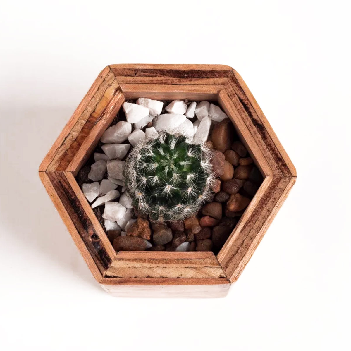 Macetitas hexagonales en madera con suculentas y tunas.